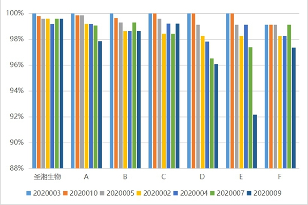 SARS-CoV-2結(jié)果陽性樣本7個面向,濃度在3.5×103到3.5×106copies/mL之間支撐作用,可反映試劑對不同濃度陽性樣本的檢出情況,從一定程度上反應(yīng)試劑盒的檢測能力(重復(fù)性建設項目、靈敏度最為突出、準確度)。各樣本不同試劑檢測結(jié)果符合率如圖: